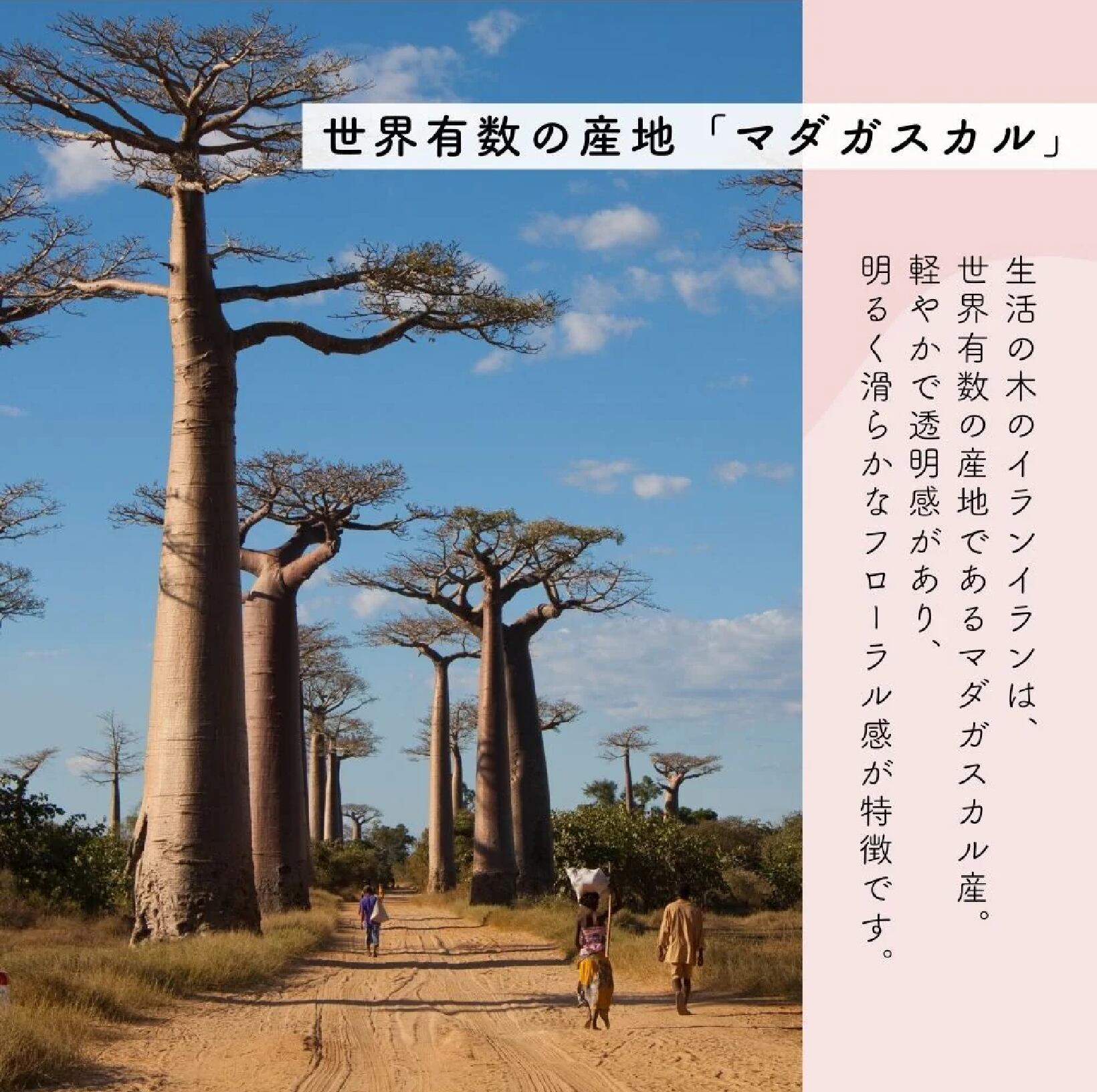 生活の木のイランイランは世界有数の産地であるマダガスカル産。明るく滑らかでフローラルか香りも特徴です。