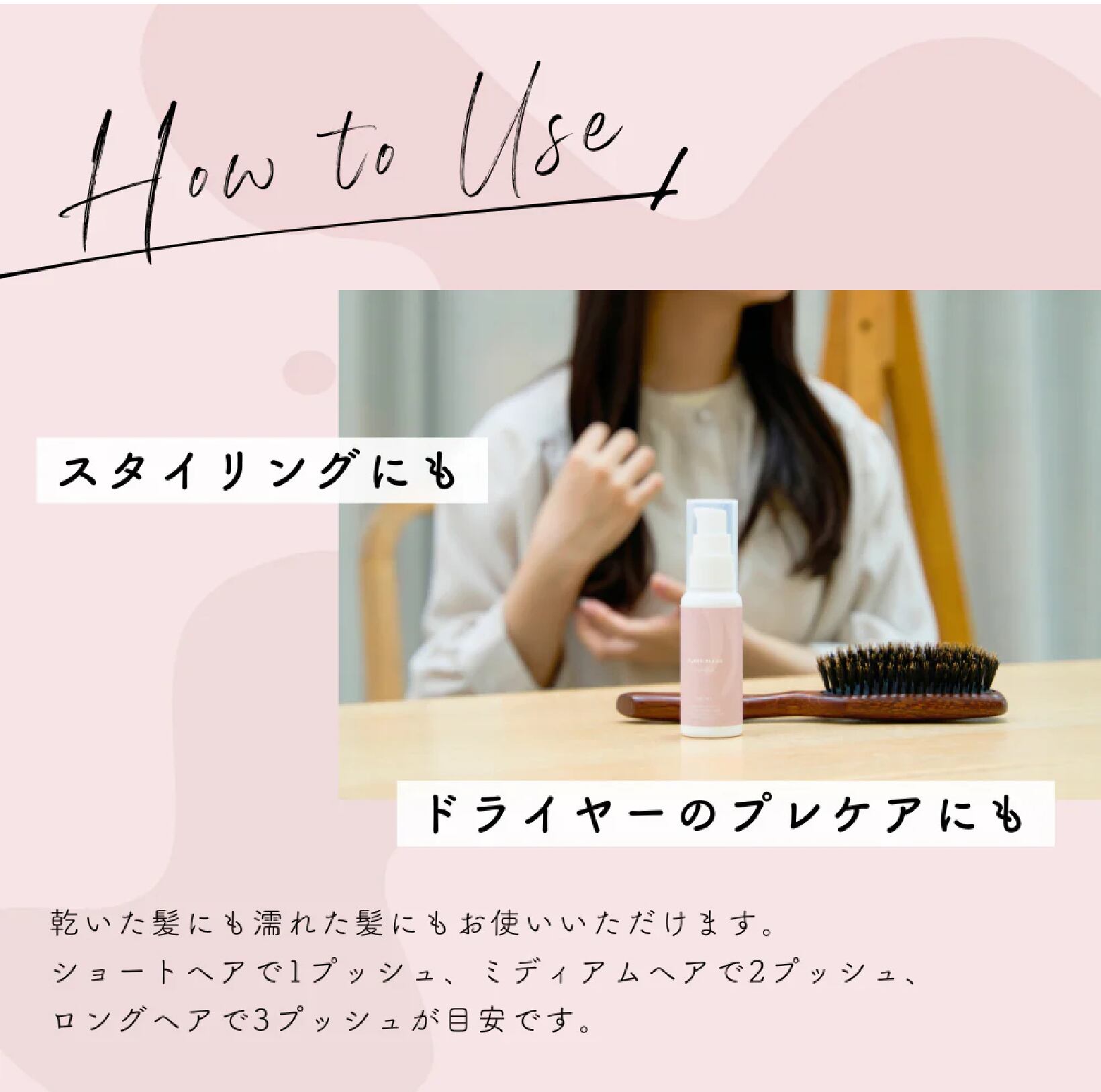 乾いた髪にも濡れた髪にもお使いいただけます。ショートヘアで1プッシュ、ミディアムヘアで2プッシュ、ロングヘアで3プッシュが目安です。