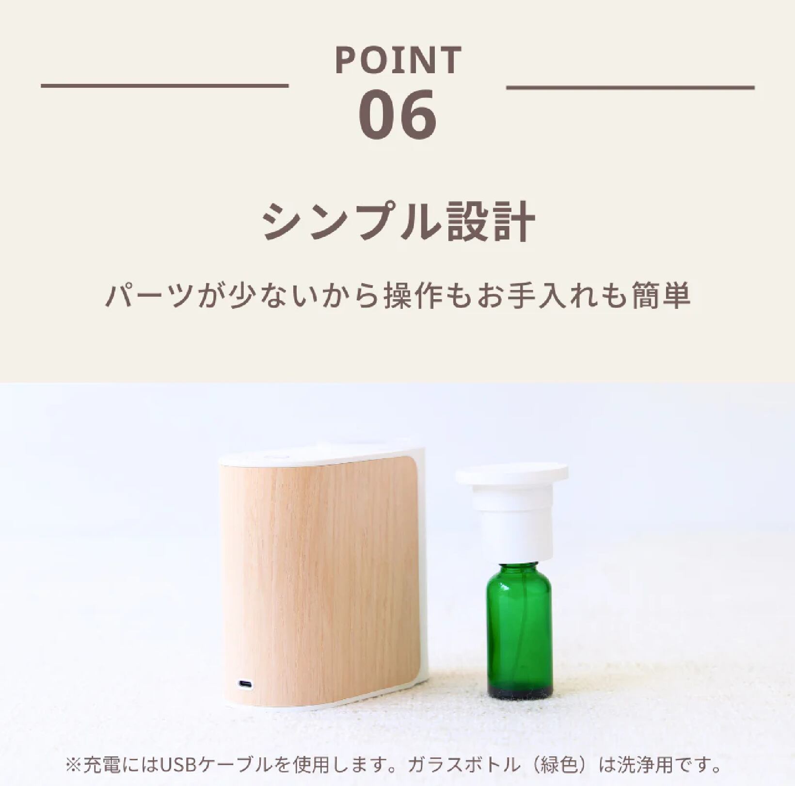 エッセンシャルオイル(精油)の微粒⼦を空気で効率よく拡散させ、精油本来の香りを楽しめるディフューザー、「アロモア」シリーズの充電式タイプです。