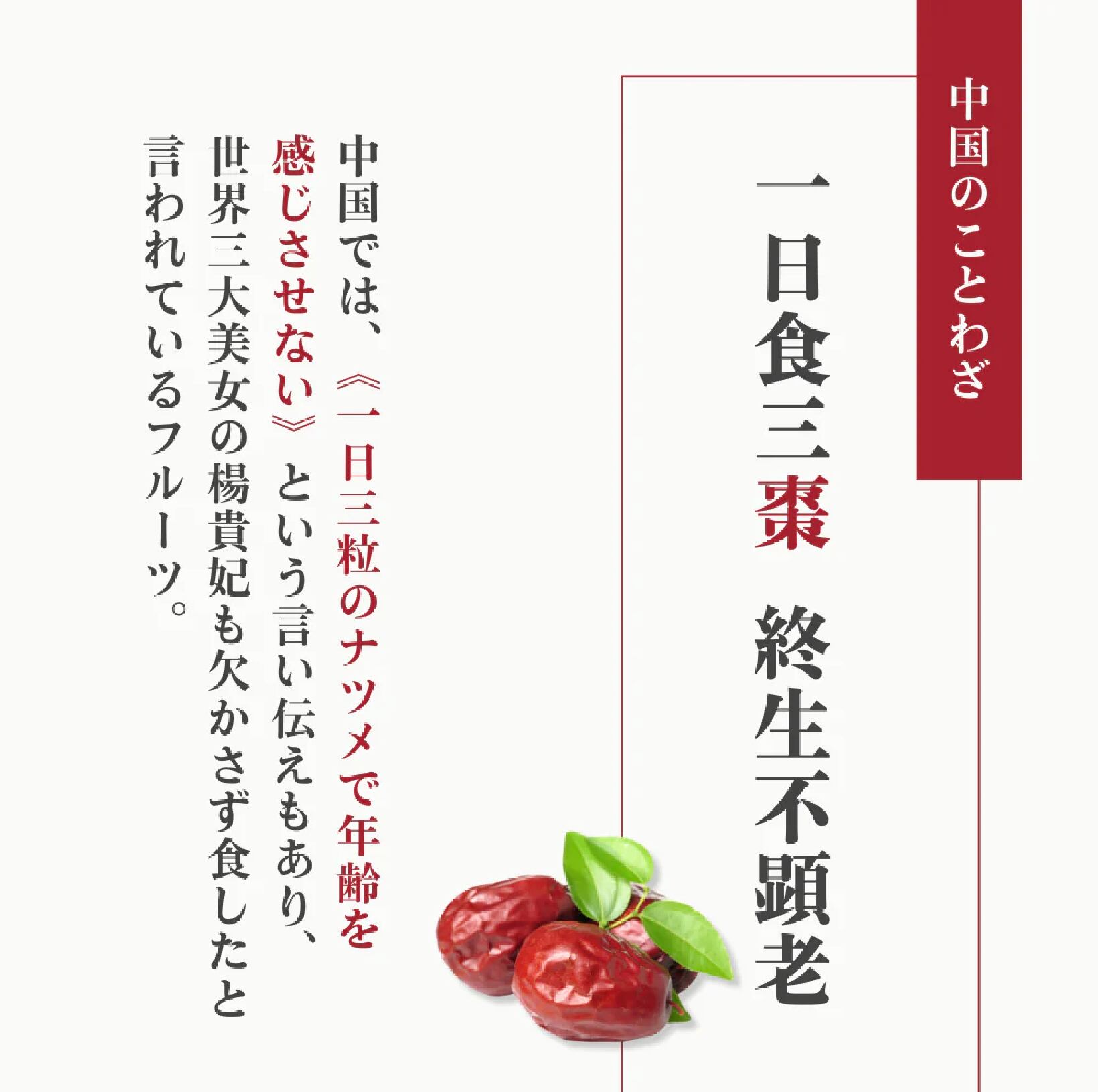 中国では古くから「一日食三棗 終生不顕老(一日三粒のナツメで年齢を感じさせない)」という言い伝えもあります。