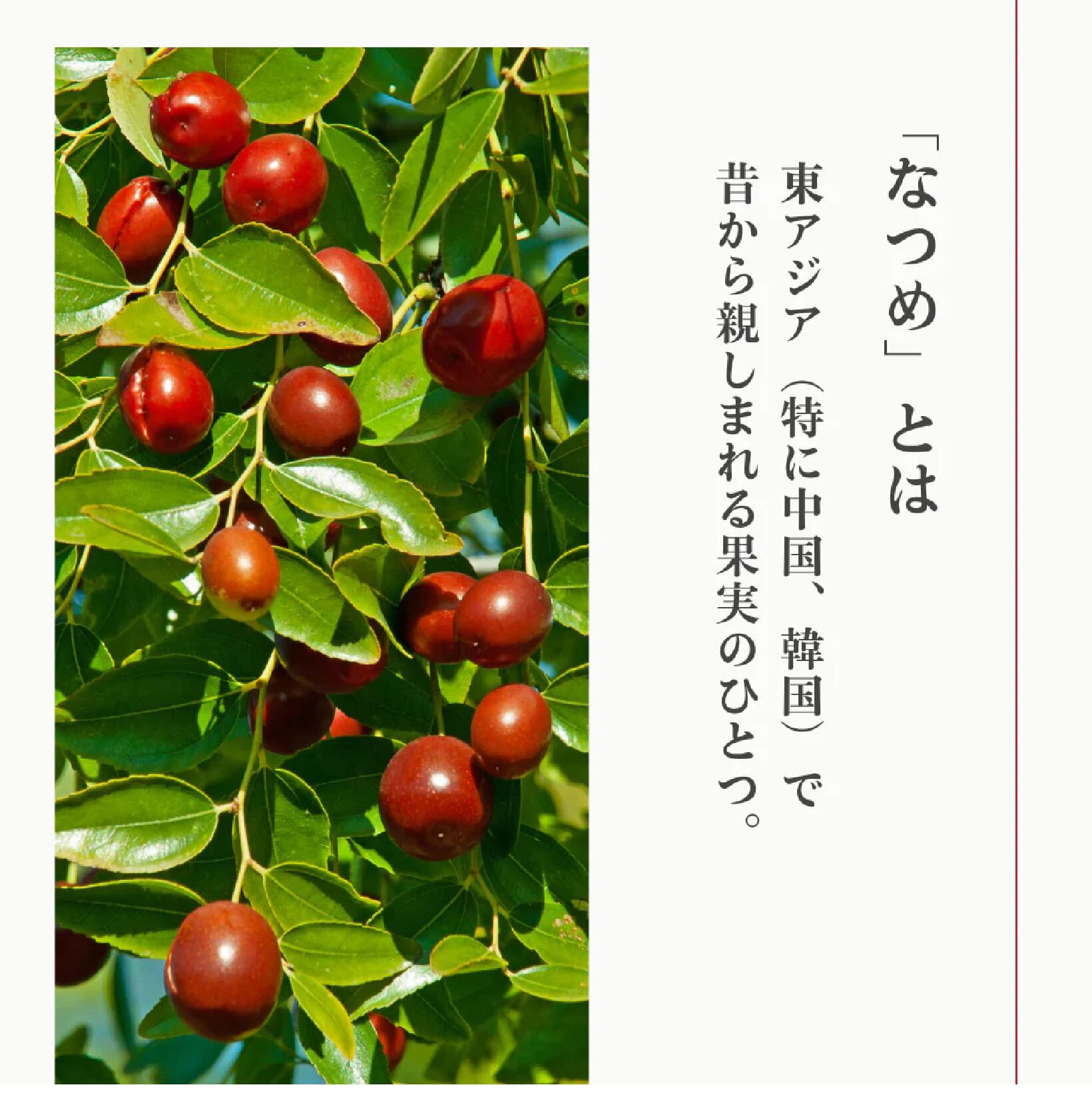 砂糖などの甘味料、香料、保存料、人口添加物は不使用、なつめの自然な甘さが楽しめます。