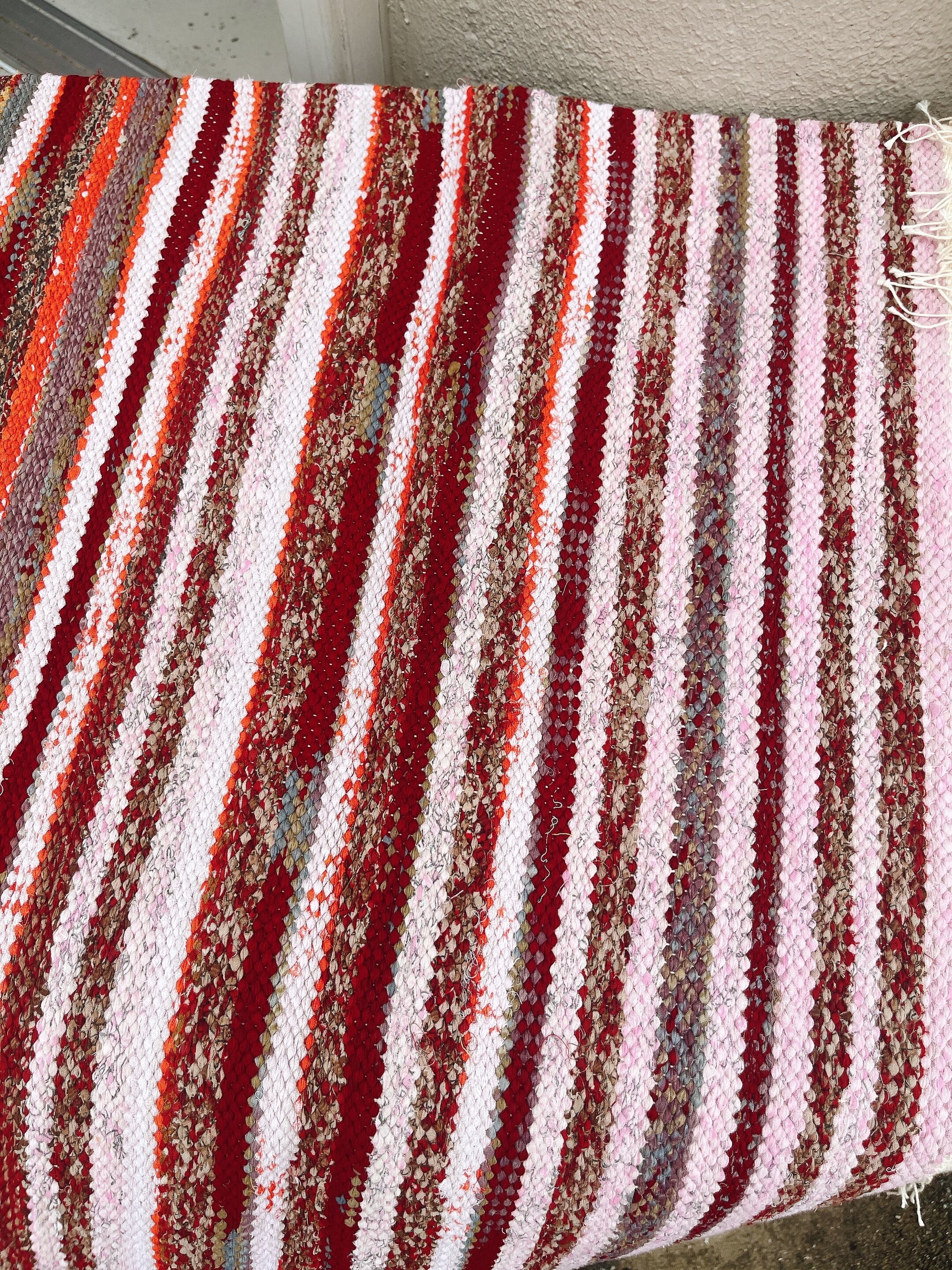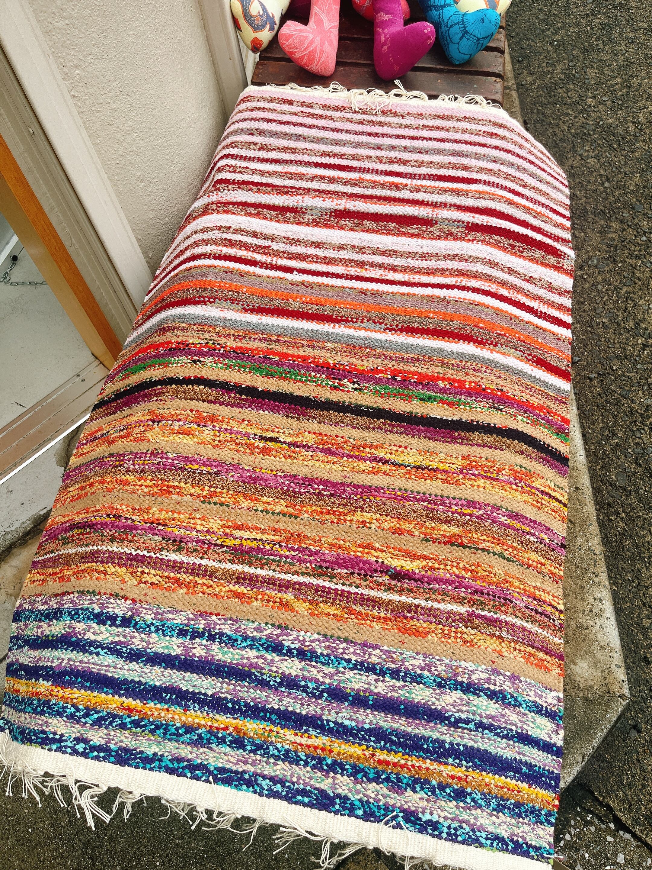 マルチカラーのリサイクルサリーが、クッションカバーとラグマットになりました。アソートカラーの素材を手織りで仕上げているので、一つとして同じ柄がありません。フリンジのあしらいがポイントです。