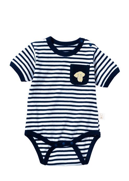 ちょっと困り顔のゾウさんが愛おしい、ストライプ柄のロンパース。ポケット付きのメリハリのあるデザインです。