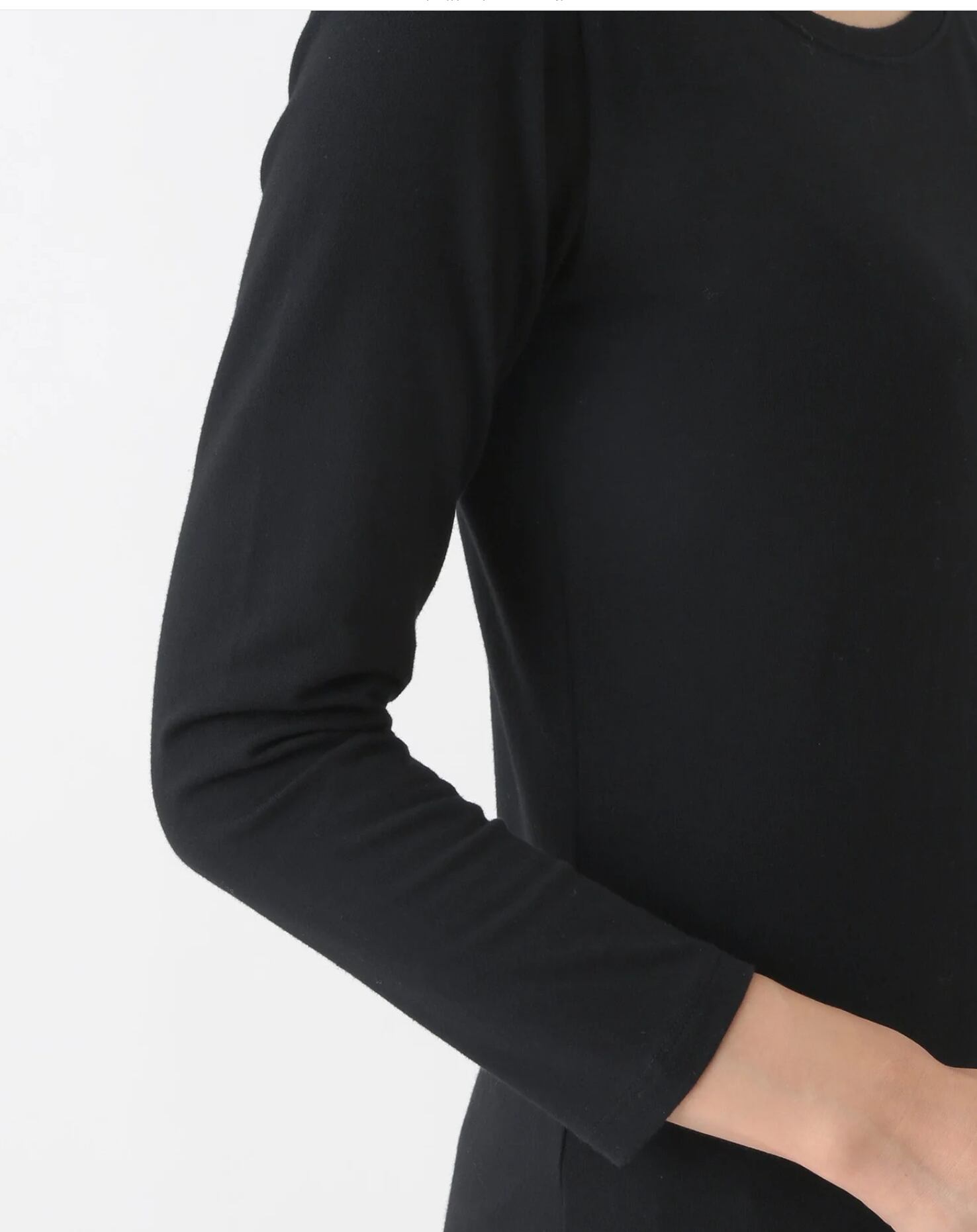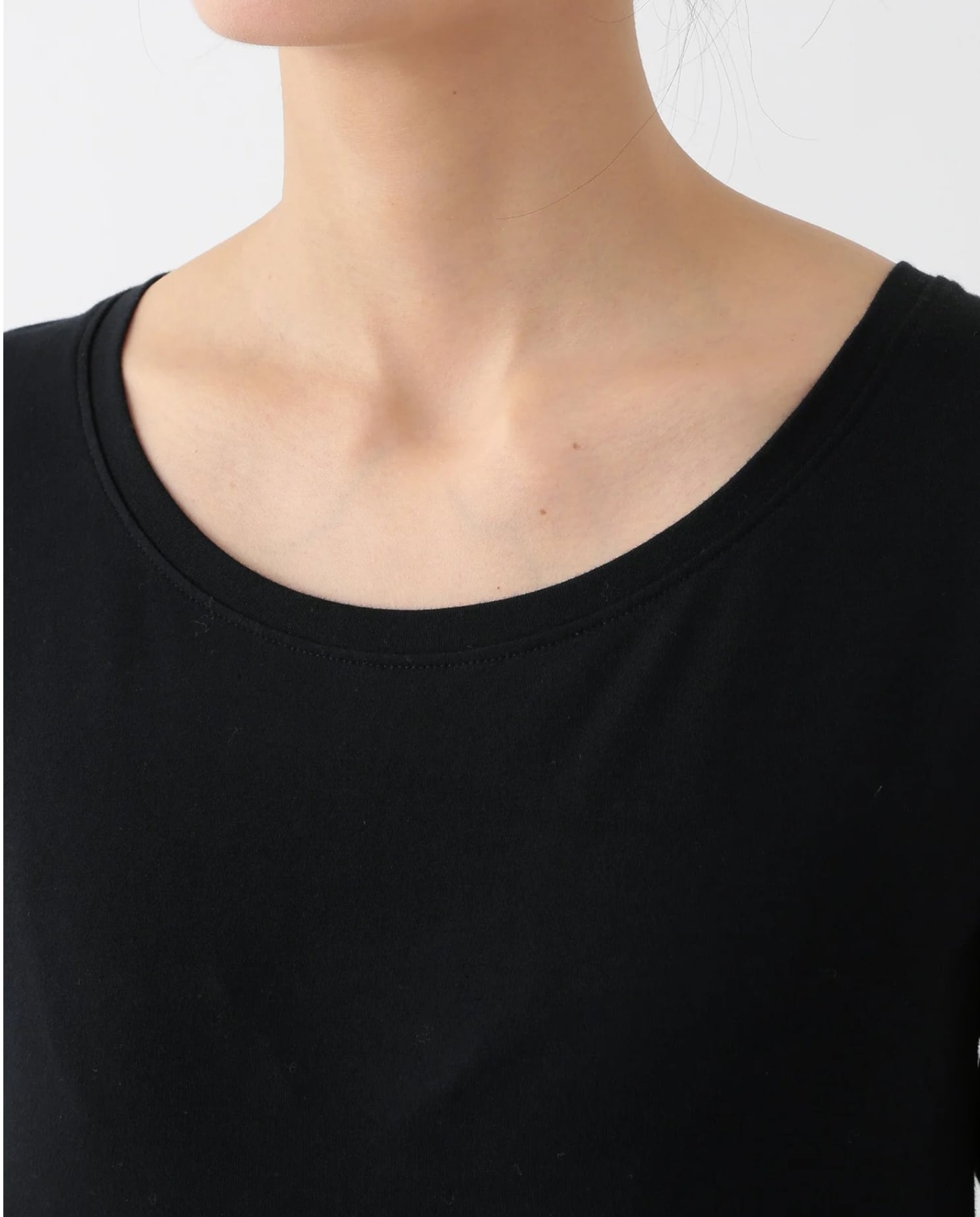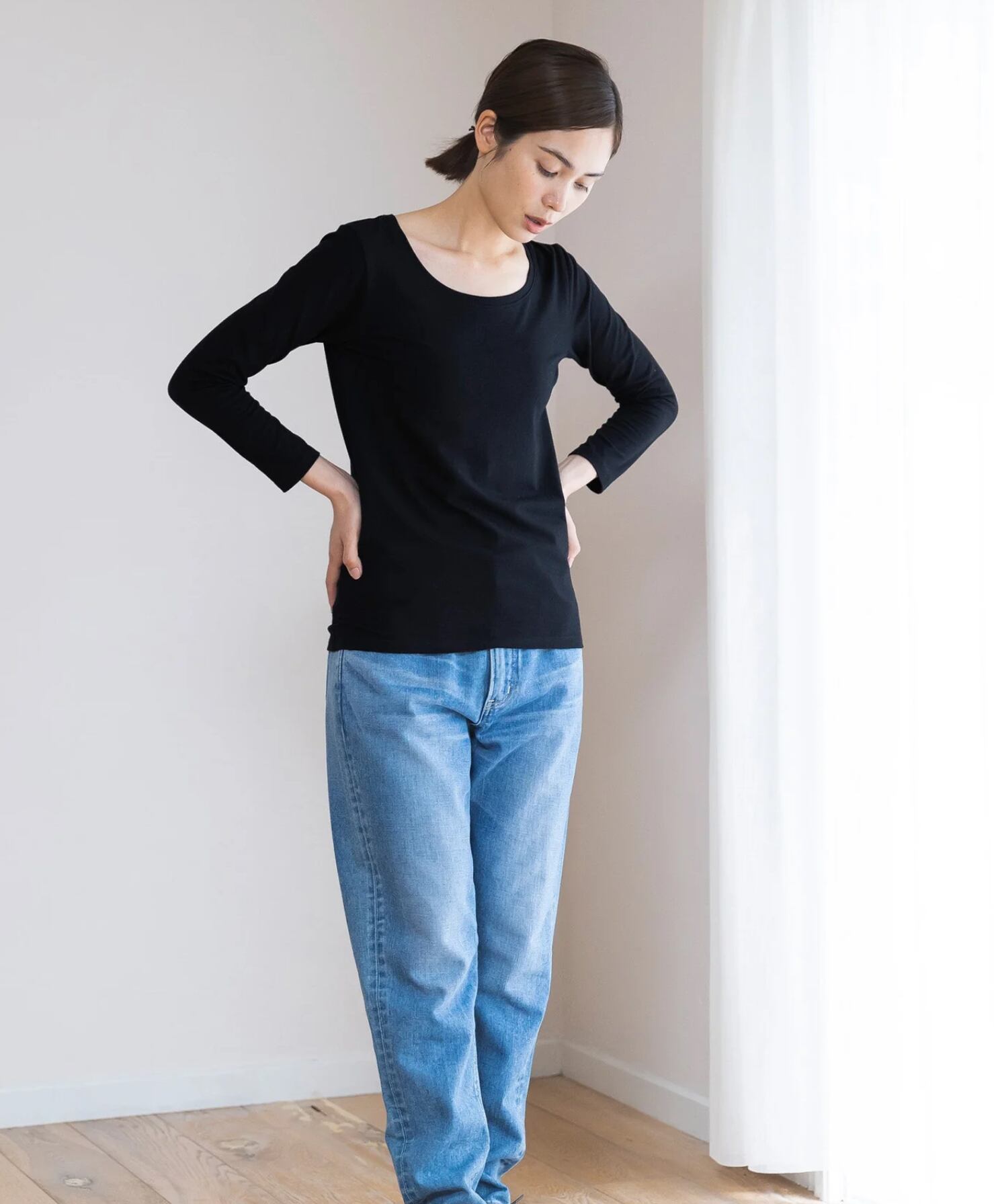 ロングセラーのアンダーウエアと同じ、なめらかな肌ざわりのオーガニックコットンストレッチ素材を使用した長袖インナー。襟ぐりの絶妙なカーブラインが女性らしいシルエットを演出します。ストレッチ素材でフィット感抜群、重ね着しても着膨れしにくく、静電気が起きにくいのも秋冬に嬉しいポイント。吸湿性にも優れ、寒い季節も快適な着心地です。