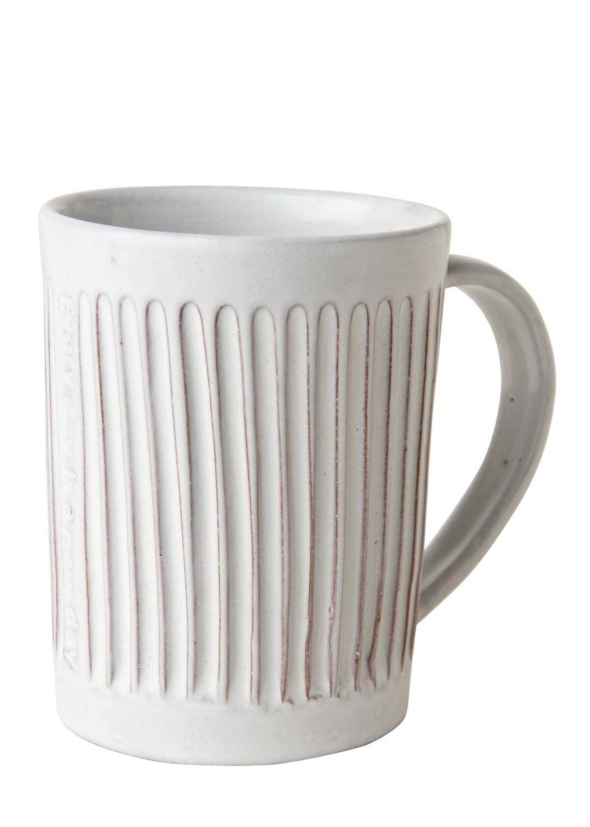 ひとつひとつ手仕事で削った溝模様が味わい深い、赤土を使った陶器のメッセージマグ。手に収まりやすい定番サイズです。